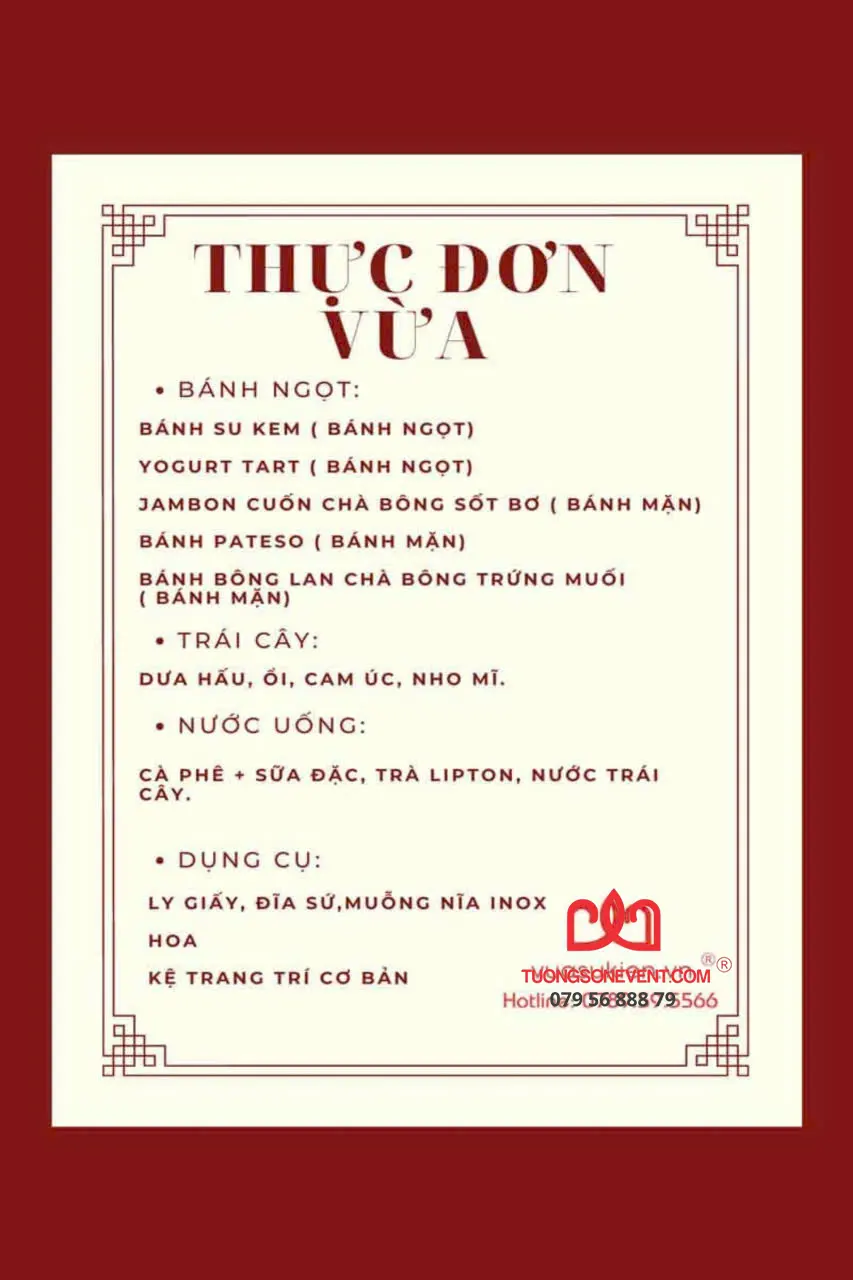 - Tư vấn và Lên ý tưởng Menu: Tường Sơn Event tiếp nhận yêu cầu về số lượng, ngân sách, và chủ đề sự kiện. Chúng tôi sẽ tư vấn gói dịch vụ phù hợp nhất (120.000đ, 160.000đ, 200.000đ) và đề xuất menu cá nhân hóa (có món mặn, ngọt, thức uống và trái cây cân bằng).
